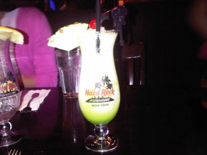 Huha, elfelejtettem a nevet, vissza kell menjek meg egyet kiprobalni, hatha akkor megjegyzem. 🙂 Hurrikan koktelt akartam inni, de aztan ennek megtetszett a szine. (Ha a kepen nem latszik jol, tok zold volt az egesz.) Persze az alapja valami tejszines-coladas cucmak volt.